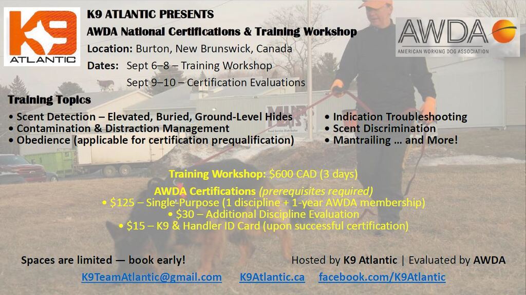 At K9 Atlantic, we specialize in providing canine training for scent detection. With over 15 years of experience in search and rescue operations, we have worked alongside law enforcement agencies on numerous missing persons cases.